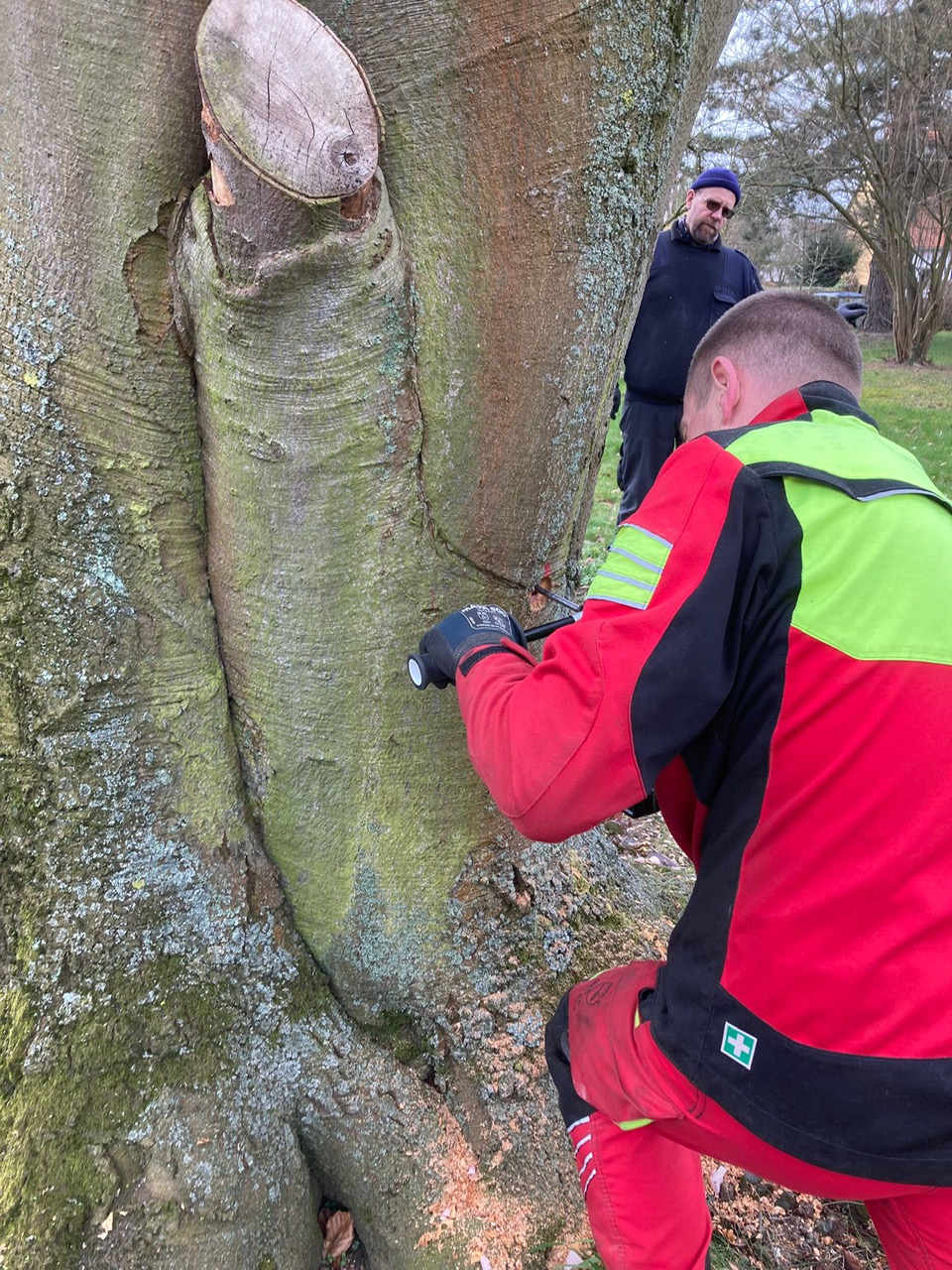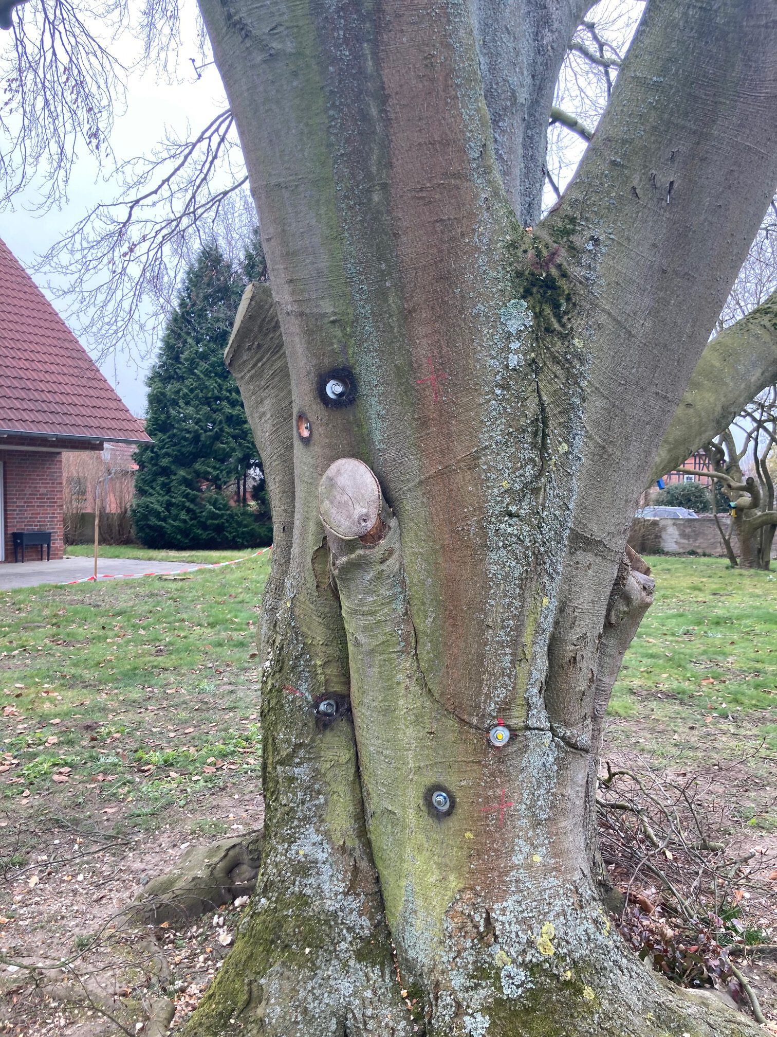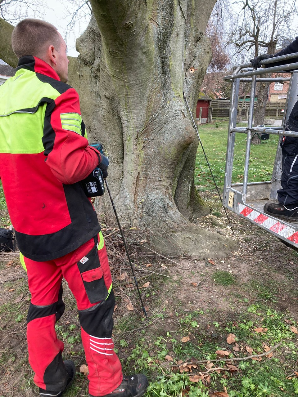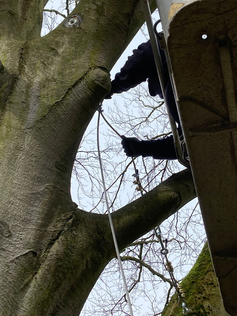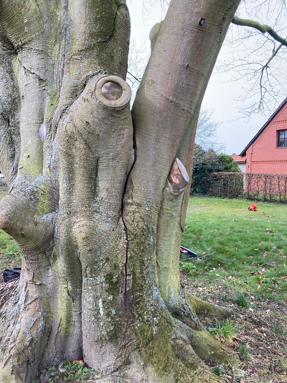 Bei einem Sturmereignis war ein Zwiesel im Bereich des Stammkopfes gerissen. Wir wurden gebeten ein Angebot für die Fällung der Buche abzugeben. Nachdem ich mir vor Ort den Schaden angesehen hatte, war mir sofort klar das dieser schöne Altbaum erhalten werden muss ! Ich stellte ein paar Berechnungen zur Windlast an und konnte dem Eigentümer schließlich ein Konzept zur Erhaltung der Buche vorstellen. Der Eigentümer war dann auch recht schnell überzeugt von unserer Maßnahme, so das wir starten konnten. Der Riss wurde von uns mittels zwei Greifzügen soweit wie möglich zusammengezogen. Danach erfolgte das verbolzen des Stammkopfes mit insgesamt 6 Gewindestangen. Anschließend wurde etwas oberhalb des Stammkopfes noch eine Stahlseilsicherung mit Spannschloss verbaut. Die Greifzüge wurden vorsichtig gelöst und im oberen Kronenbereich noch Textile Sicherungen verbaut. Im Anschluss wurde noch eine Tiefenvorratsdüngung durchgeführt, bei der wir die Arbeitsleistung kostenlos durchgeführt haben.